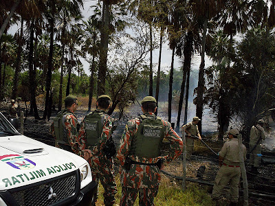 A polícia ambiental esteve no local enquanto os Bombeiros realizavam os trabalhos para conter as chamas que atingiam a cerca de marcação do terreno para evitar que as chamas chegassem até as residências próximas.